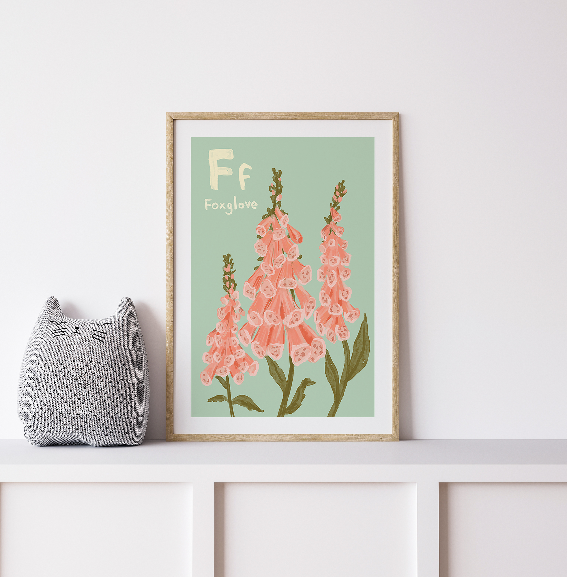 Foxglove Print on green as part of the alphabet collection. Hand illustrated and printed in-house.